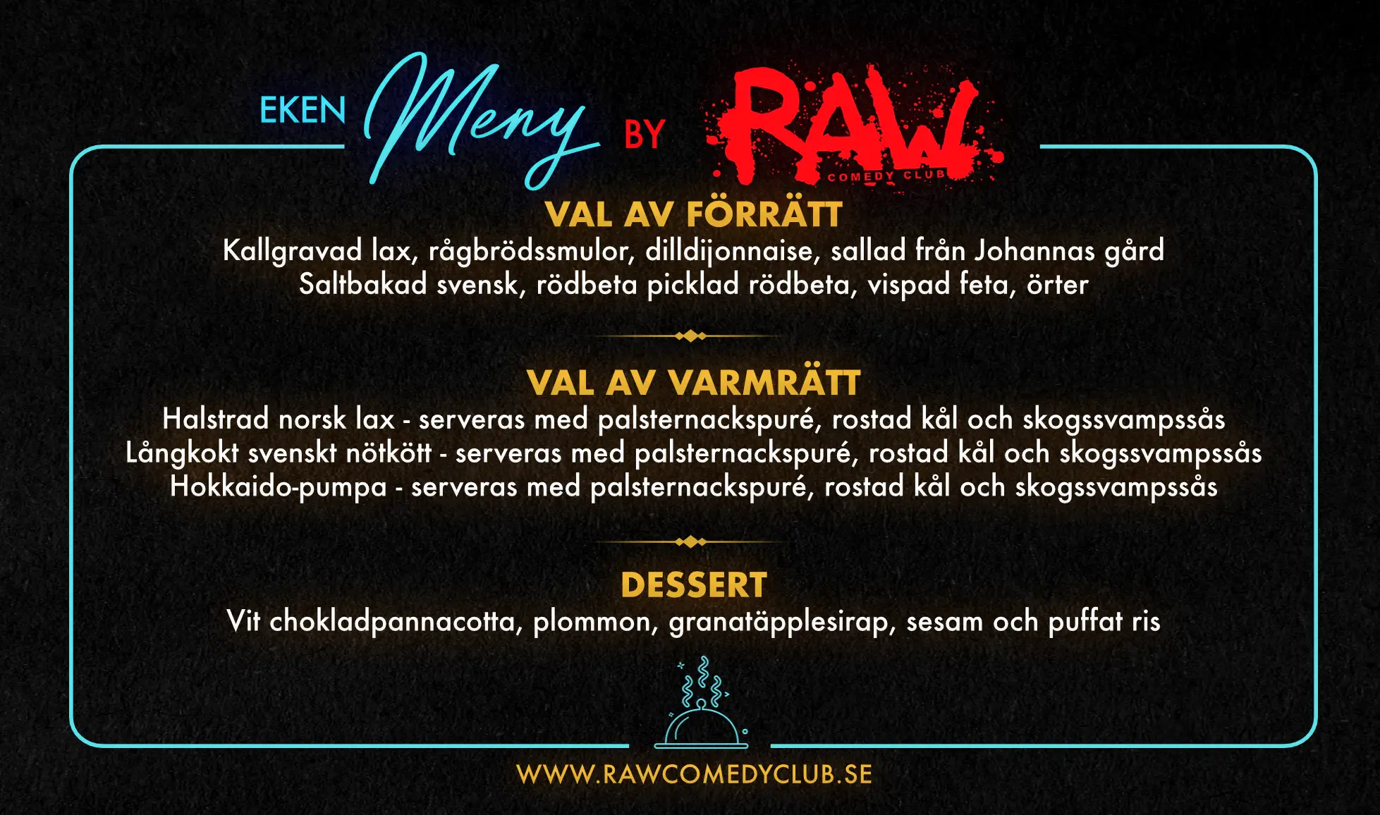 Sätt en extra guldkantat på din upplevelse! När du bokar RAW populära middagspaket får du inte bara njuta av en fantastisk 3 rätters middag utan du får också våra bästa platser på showen – reserverade till dig och ditt sällskap.